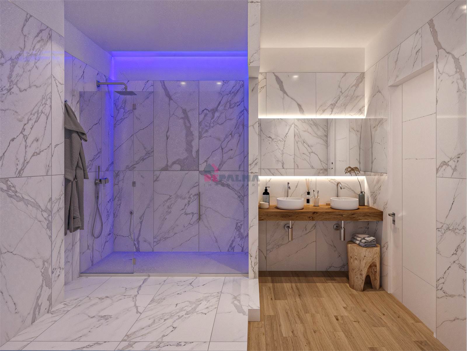 L’ingresso, tramite porta blindata, conduce in una luminosa zona living open space con angolo cottura, completamente controsoffittata e valorizzata da illuminazione LED.