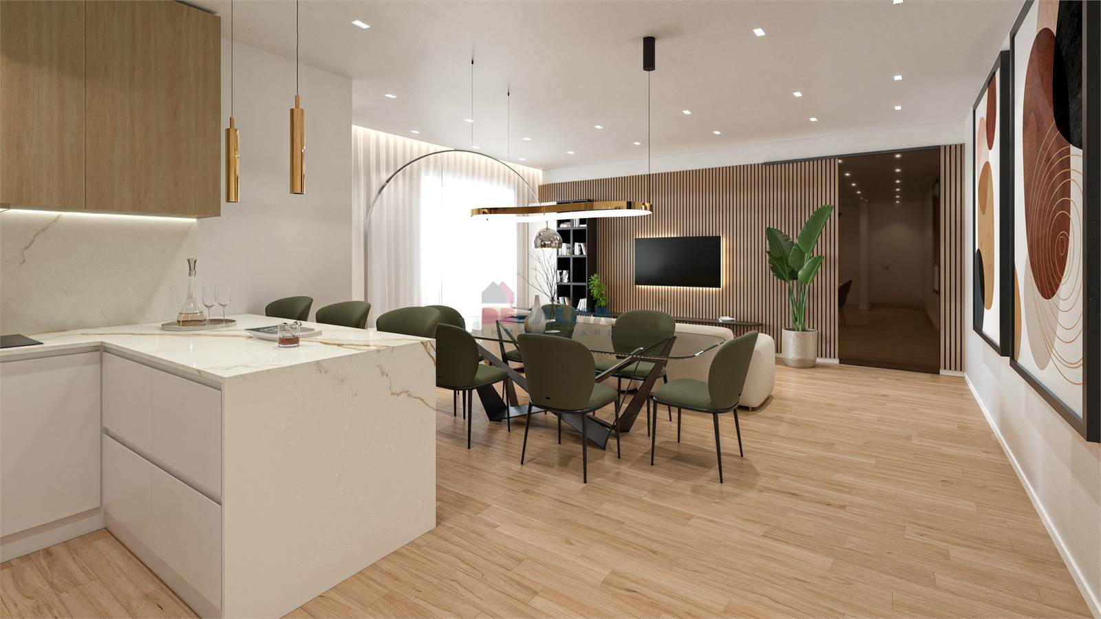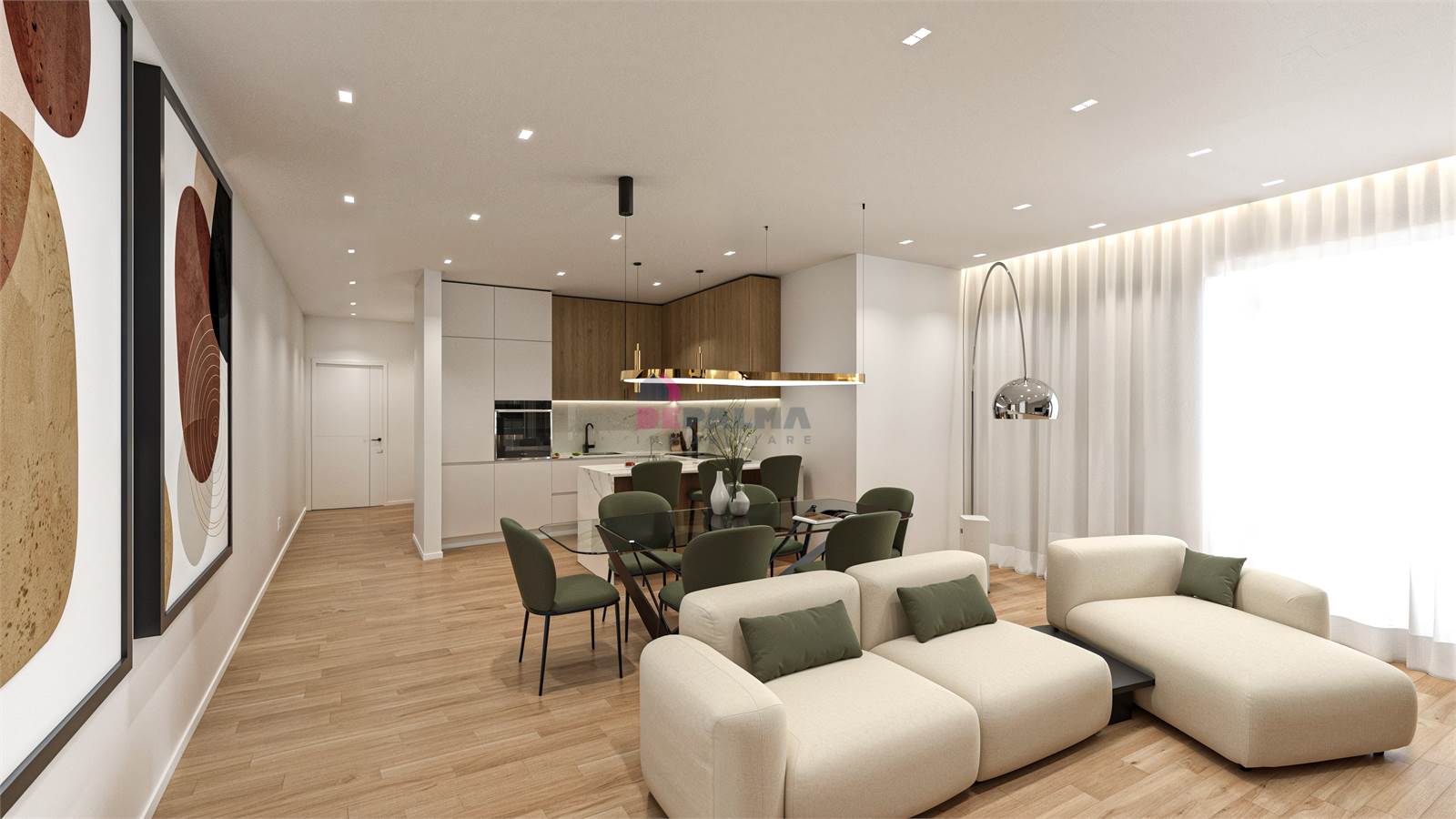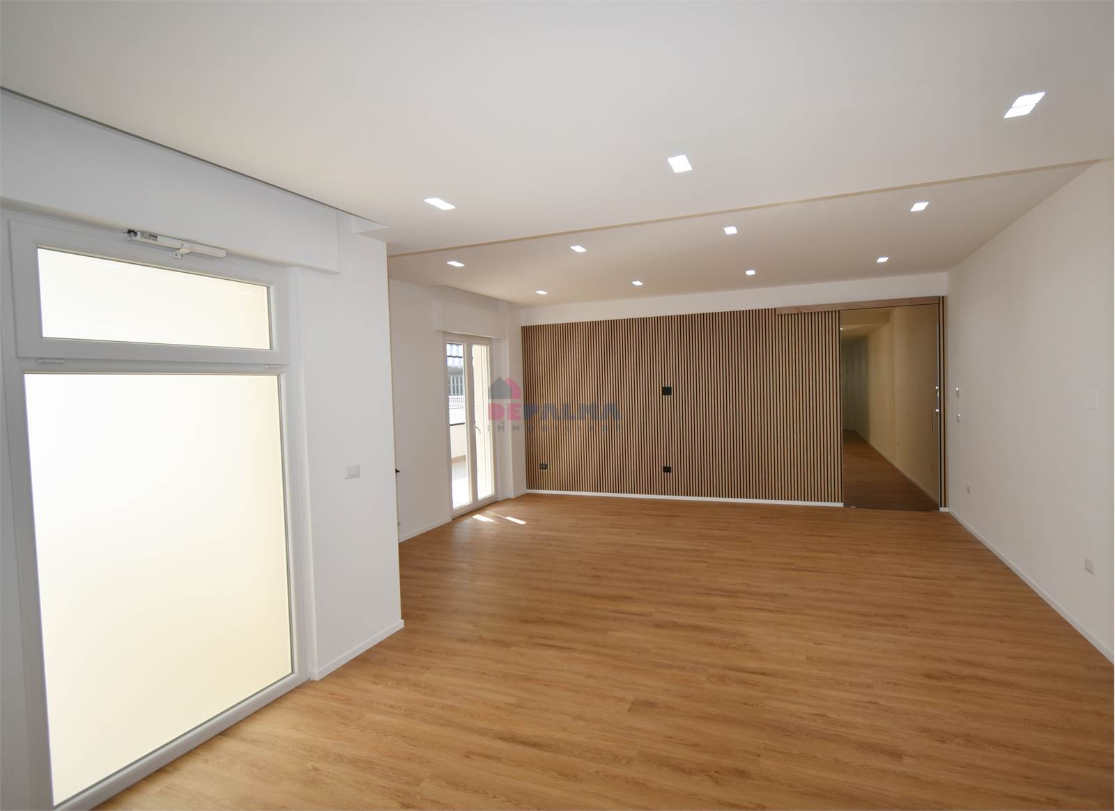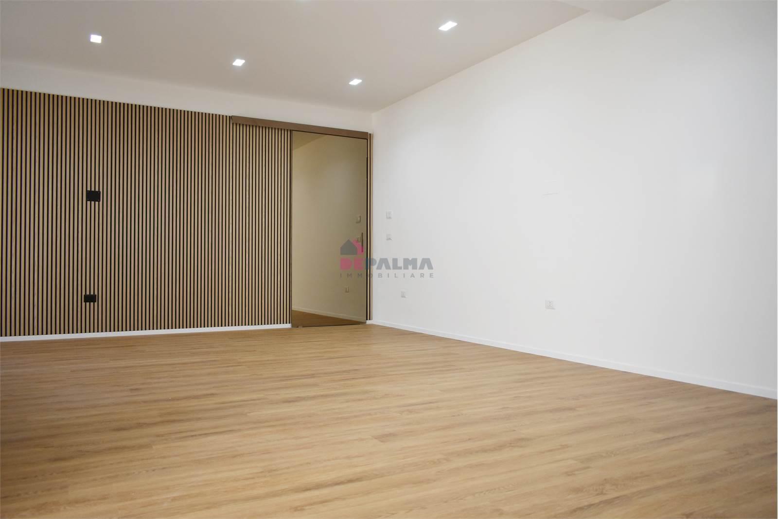 L’ingresso, tramite porta blindata, conduce in una luminosa zona living open space con angolo cottura, completamente controsoffittata e valorizzata da illuminazione LED.